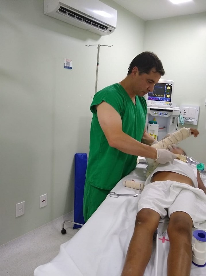 O Dr. Luciano Brasil, coordenador do Serviço de Traumatologia Infantil, do Hospital Infantil Francisco de Assis, realizando mais um procedimento ortopédico, uma redução incruenta de fratura.